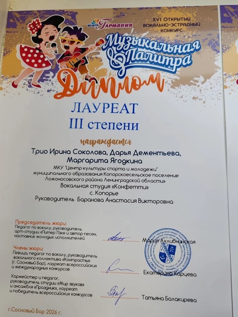 Трио: Дарья Дементьева, Маргарита Ягодкина и Ирина Соколова — Диплом Лауреата III степени.