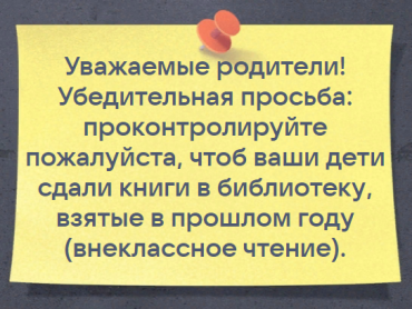 Уважаемые родители! Убедительная просьба: проконтролируйте, пожалуйста, сданы ли книги в библиотеку взятые в прошлом году.