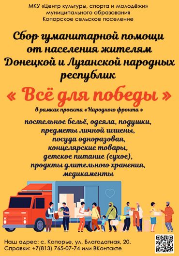 В рамках проекта Народного фронта «Все для победы!», в Центре культуры организован пункт приема гуманитарной помощи от населения жителям Донецкой и Луганской народных республик.