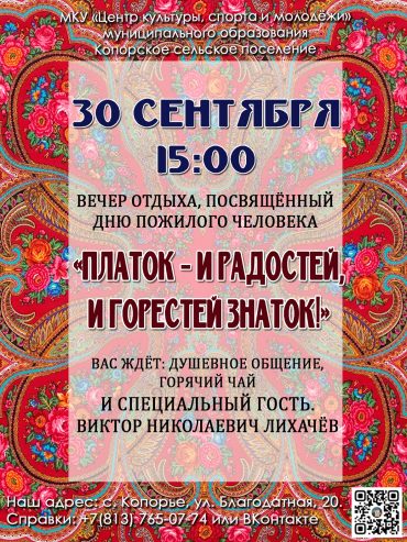 30 Сентября в 15:00 (пятница) приглашаем в МКУ «Центр культуры, спорта и молодежи» Копорье на вечер отдыха посвящённый, дню пожилого человека: «Платок — и радостей, и горестей знаток».