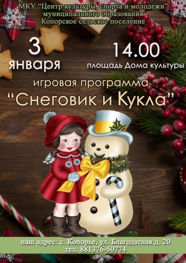 3 Января в 14:00 приглашаем всех на игровую программу «Снеговик и Кукла»