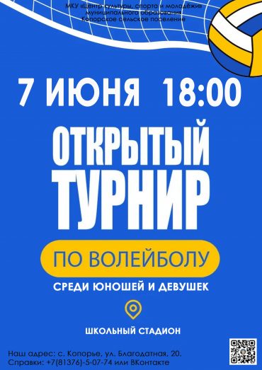 Приглашаем жителей Копорья принять участие в открытом турнире по волейболу 7 июня в 18:00