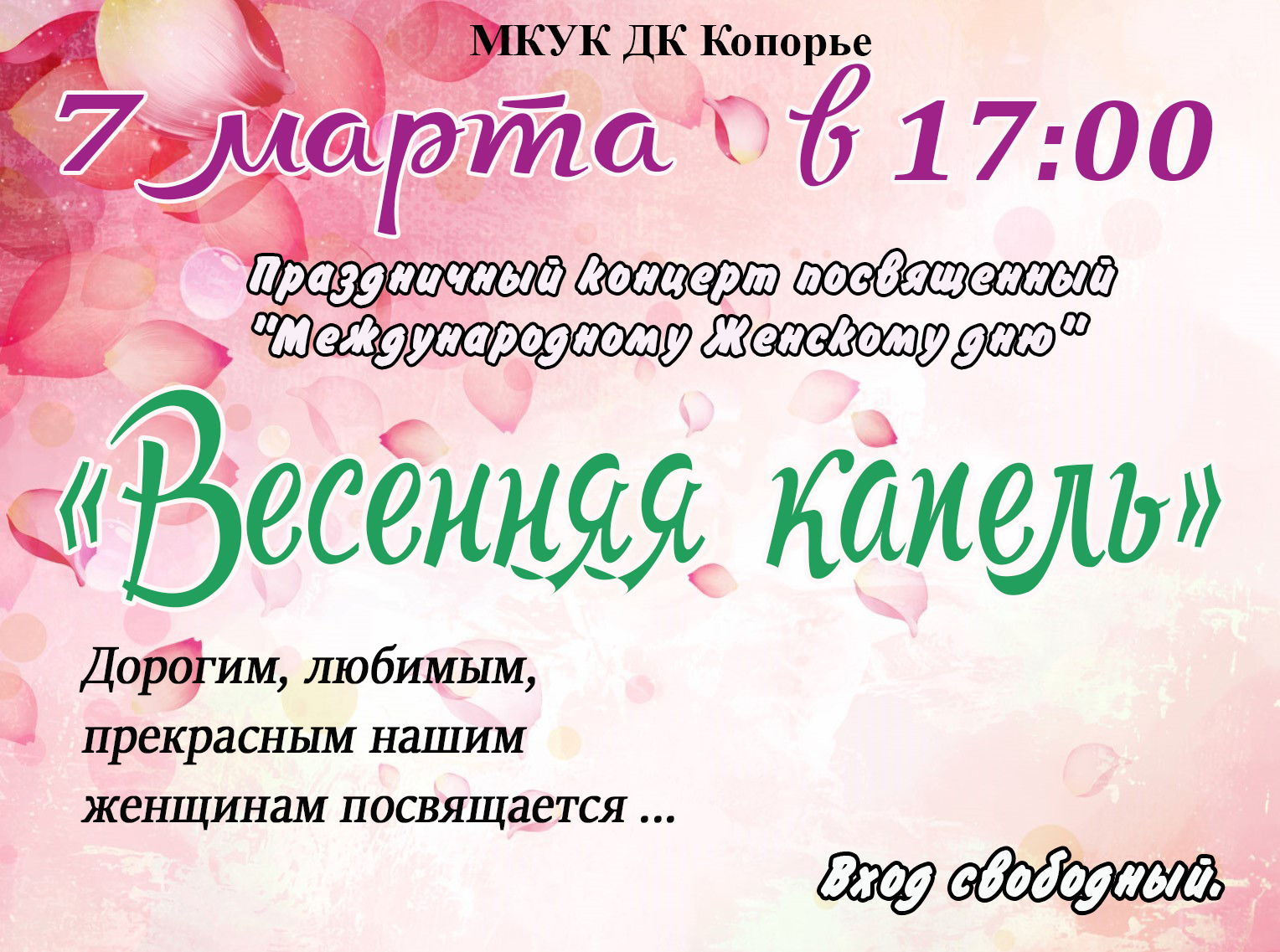 Всех желающих приглашаем на концерт 7 марта в 17:00 посвященный 8 марта Опубликовано 02.03.2018 в рубрике Афиша, Мероприятия, Новости