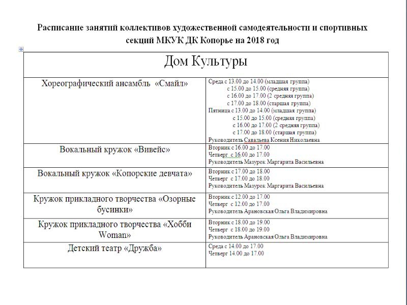 Расписание занятий коллективов художественной самодеятельности и спортивных секций МКУК ДК Копорье на 2018 год. Опубликовано 06.04.2018 в рубрике Афиша, Информация о деятельности, Кружки, Новости, Общая информация