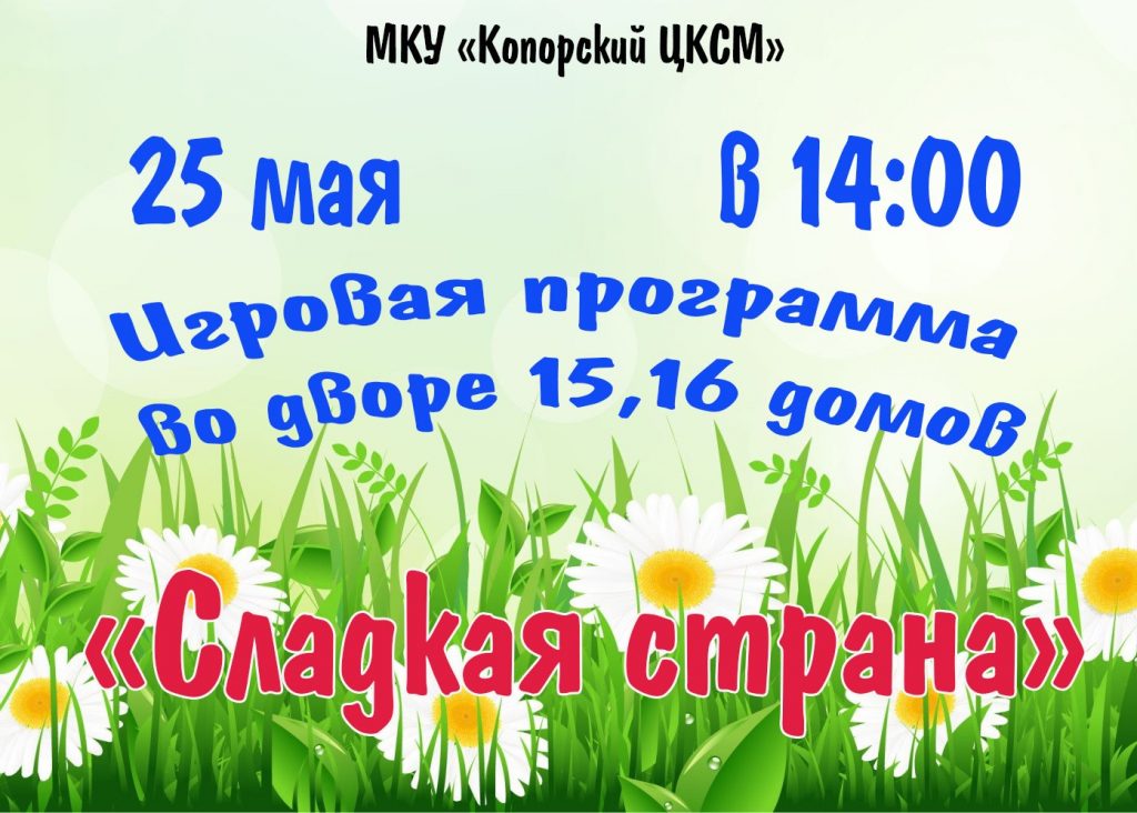 25 мая в 14:00 Игровая программа «Сладкая страна» Опубликовано 20.05.2018 в рубрике Афиша, Информация о деятельности, Мероприятия, Новости