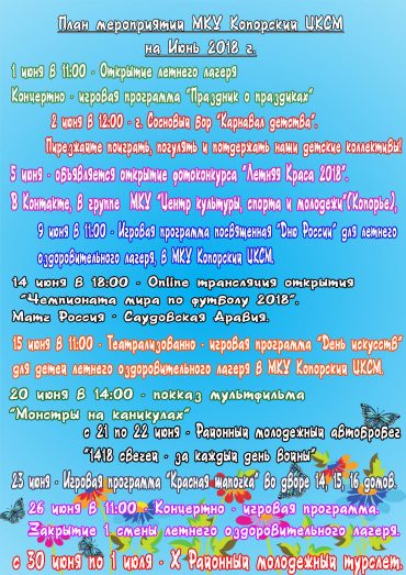 План мероприятий на Июнь 2018 Опубликовано 31.05.2018 в рубрике Афиша, Информация о деятельности, Мероприятия, Новости О времени проведения всех мероприятий будет сообщатся дополнительно.