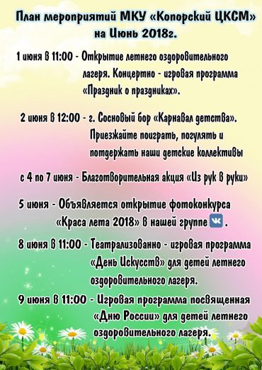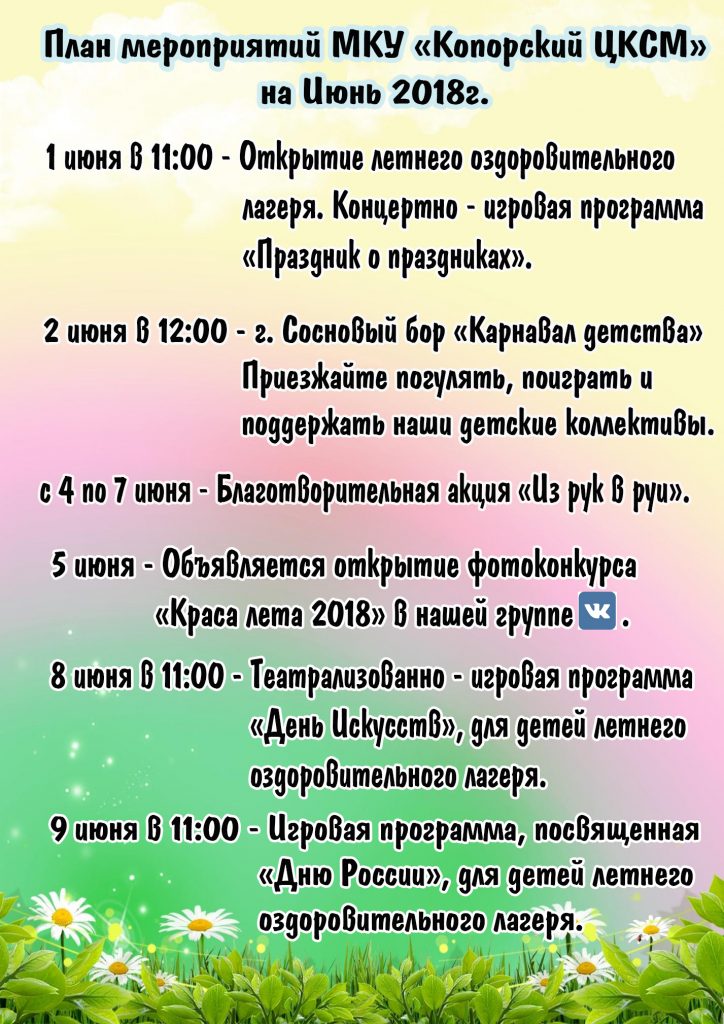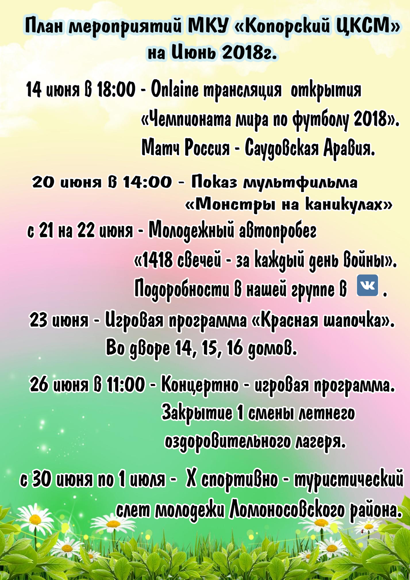 План мероприятий на Июнь 2018 с изменениями Опубликовано 04.06.2018 в рубрике Афиша, Информация о деятельности, Мероприятия, Новости Время проведения мероприятий будет сообщаться дополнительно.