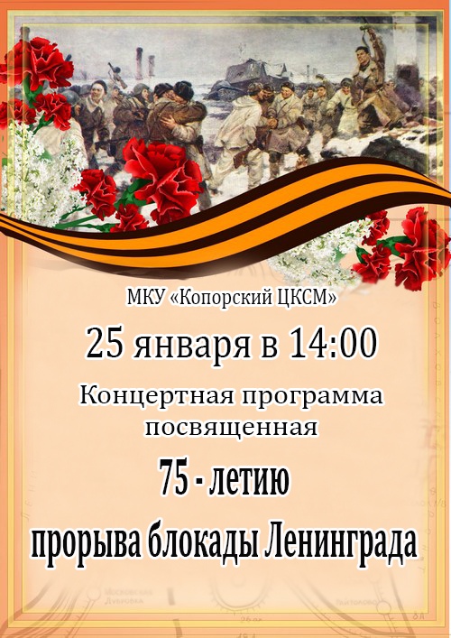 25 января в 14:00 Концертная программа посвященная «75 летию Прорыва блокады Ленинграда» Опубликовано 19.01.2019 в рубрике Афиша, Информация о деятельности, Мероприятия, Новости