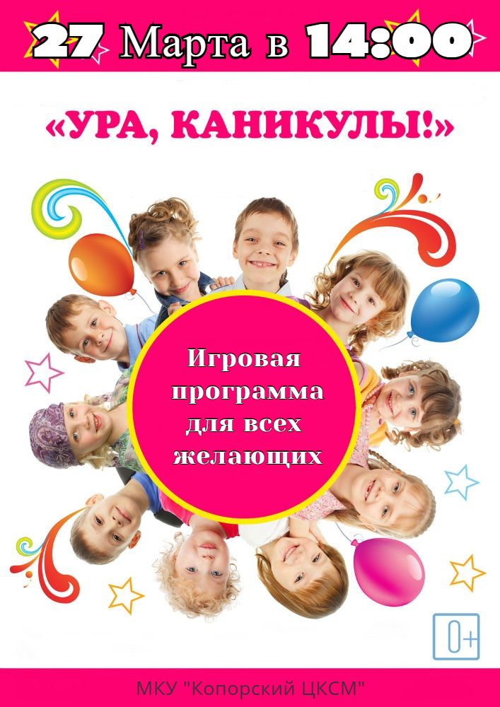 27 марта игровая программа «Ура, Каникулы!» для всех желающих. Опубликовано 26.03.2019 в рубрике Афиша, Мероприятия, Новости