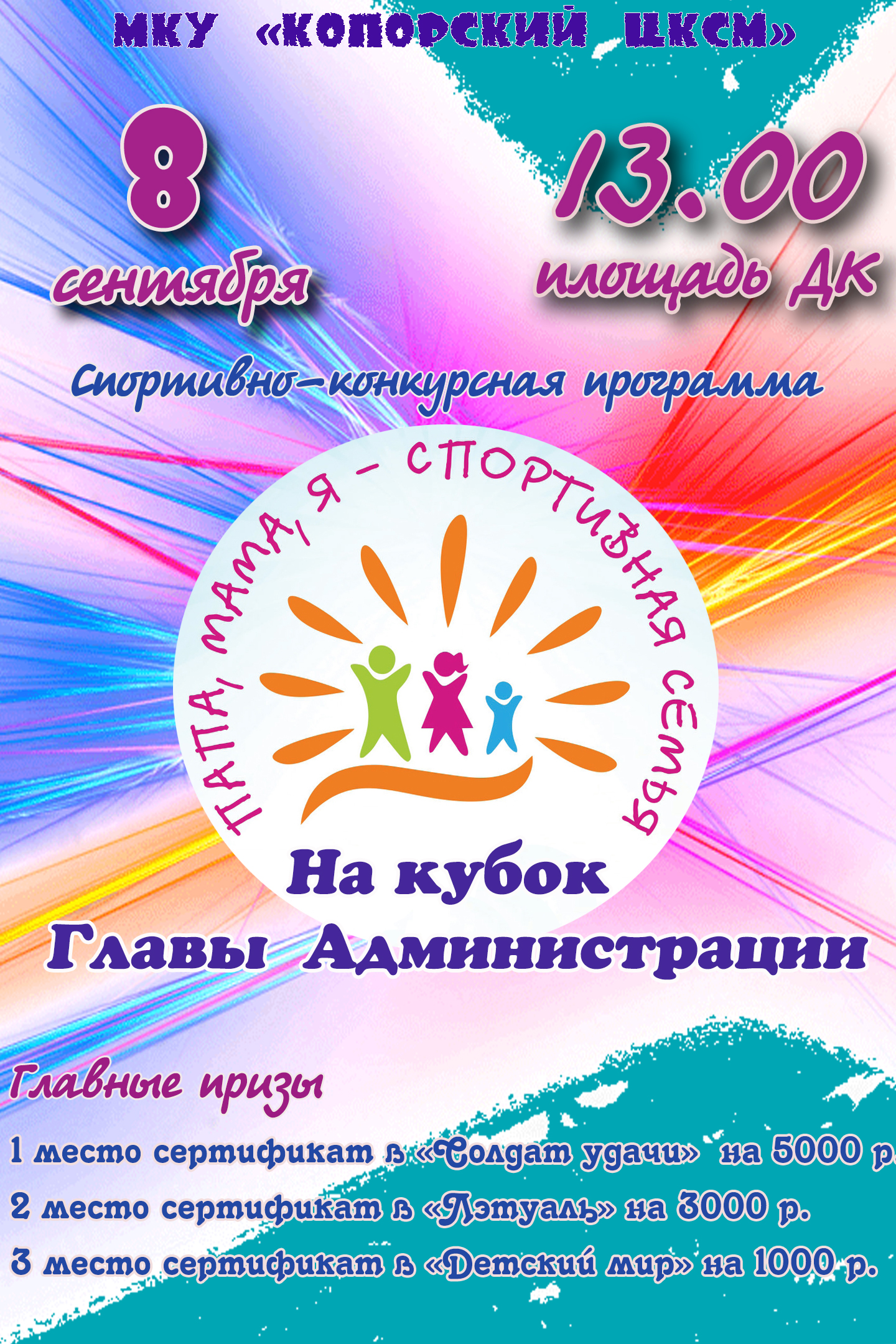 Приглашаем вас принять участие в спортивно-конкурсной программе «МАМА, ПАПА, Я — СПОРТИВНАЯ СЕМЬЯ», которое будет проходить 8 сентября 2019 года в ДК Копорье.