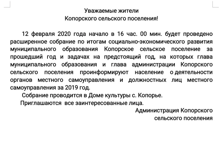12 февраля 2020 года собрание по итогам социально-экономического развития муниципального образования Копорское СП Опубликовано 07.02.2020 в рубрике Афиша, Новости