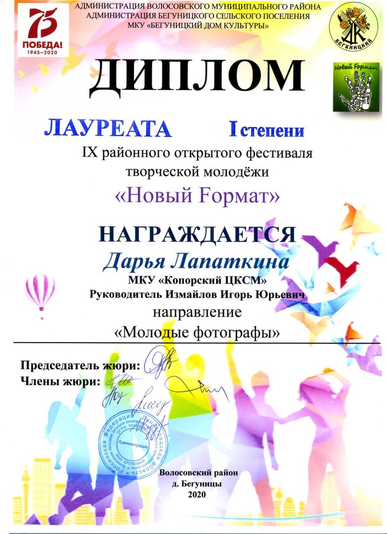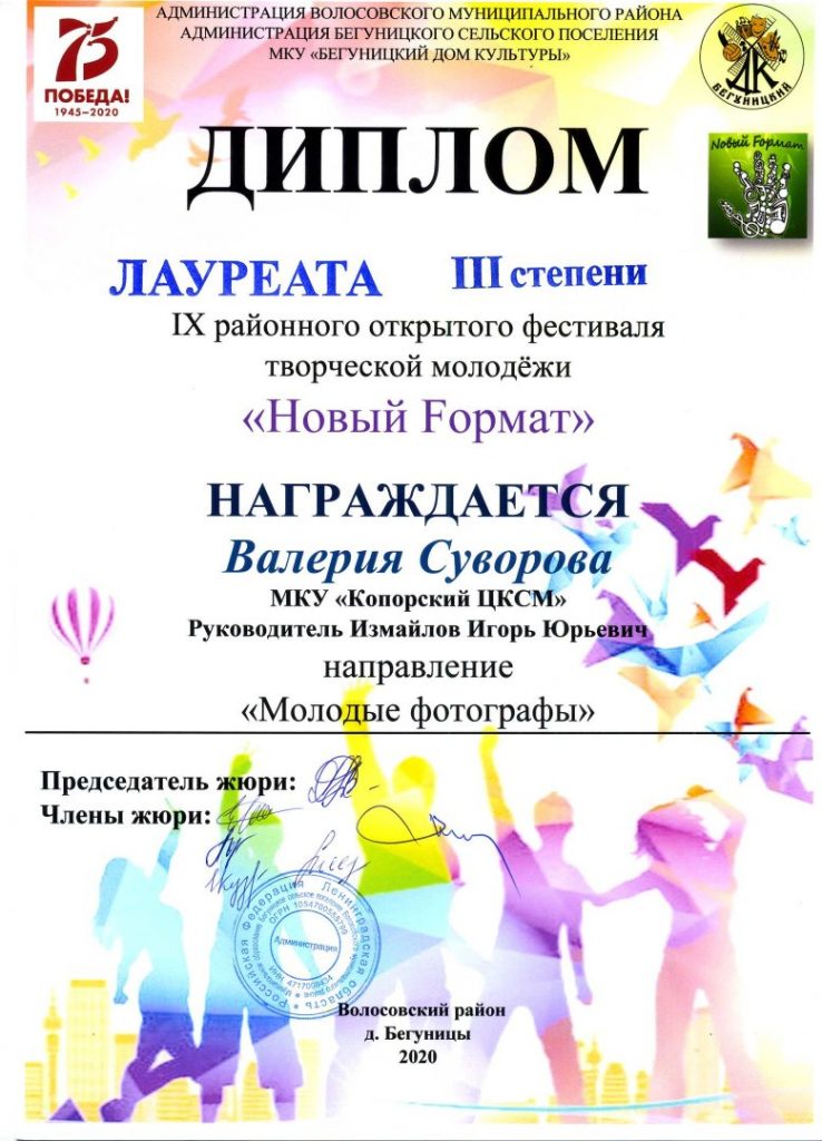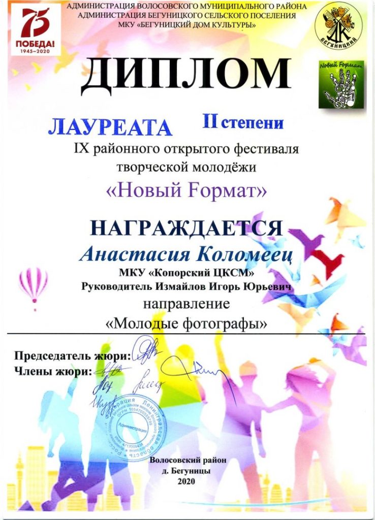2. Фотогруппа «Копорье» под руководством Измайлова Игоря Юрьевича. Поздравляем Лапаткину Дарью, занявшую 1 место в номинации «Молодой фотограф» и Коломеец Анастасию, занявшую 2 место в номинации «Молодой фотограф»и 3 место в номинации «Молодой фотограф» Суворову Валерию!!!