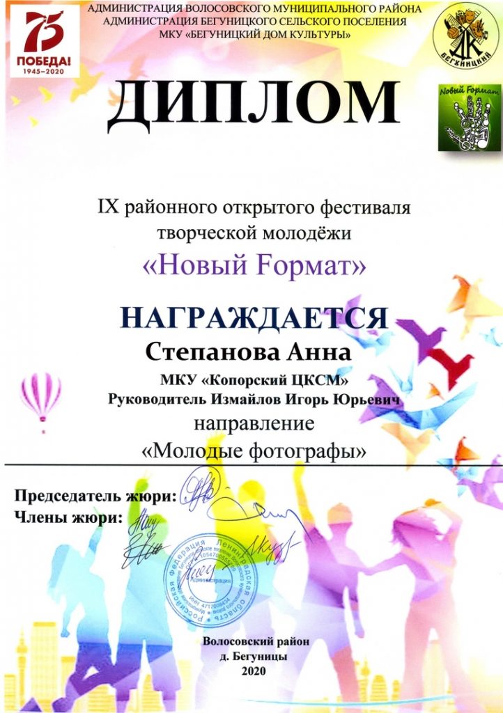 ника Фото группы Дарью Лапаткину с победой (1 место) в Районном (Волосовский район) открытом фестивале творческой молодежи Nовый Fормат ( номинация-Молодой фотограф)!Фото группа Копорье поздравляет Ученика Фото группы Анастасию Коломеец с победой (2 место) в Районном (Волосовский район) открытом фестивале творческой молодежи Nовый Fормат ( номинация-Молодой фотограф)!