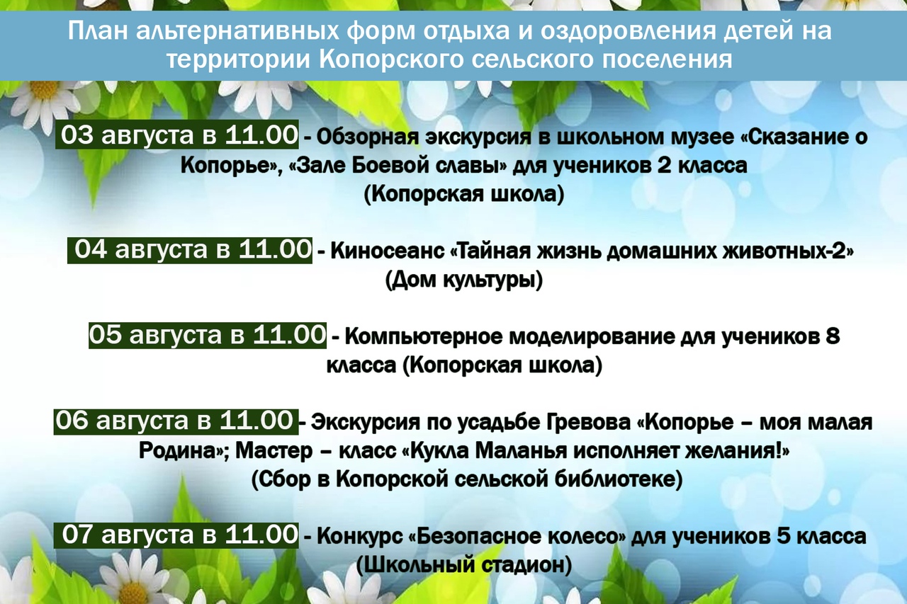 План альтернативных форм отдыха т оздоровления детей на территории Копорского сельского поселения Опубликовано 29.07.2020 в рубрике Афиша, Новости