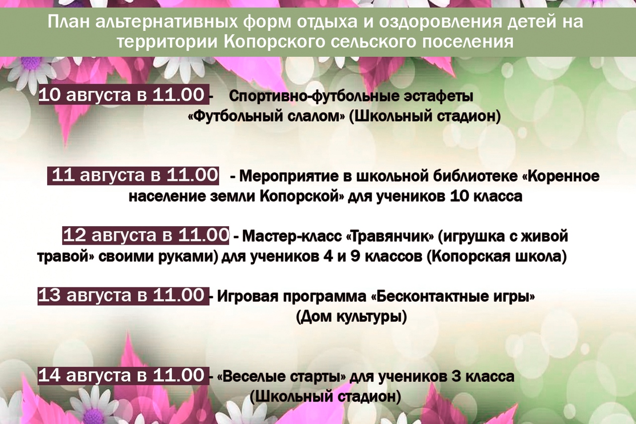 план альтернативных форм отдыха и оздоровления детей на территории Копорского сельского поселения Опубликовано 07.08.2020 в рубрике Афиша, Новости