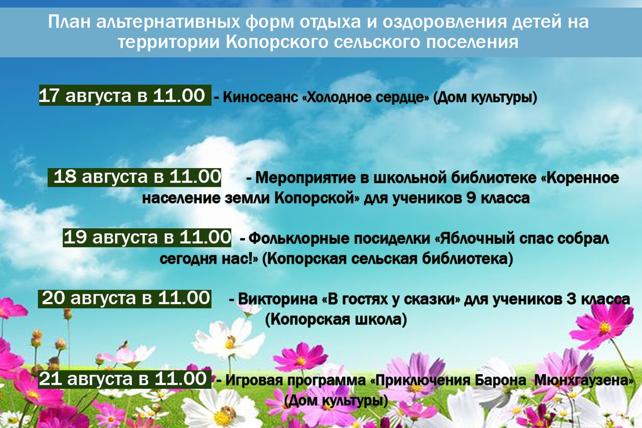 план альтернативных форм отдыха и оздоровления детей на территории Копорского сельского поселения Опубликовано 14.08.2020 в рубрике Афиша, Новости