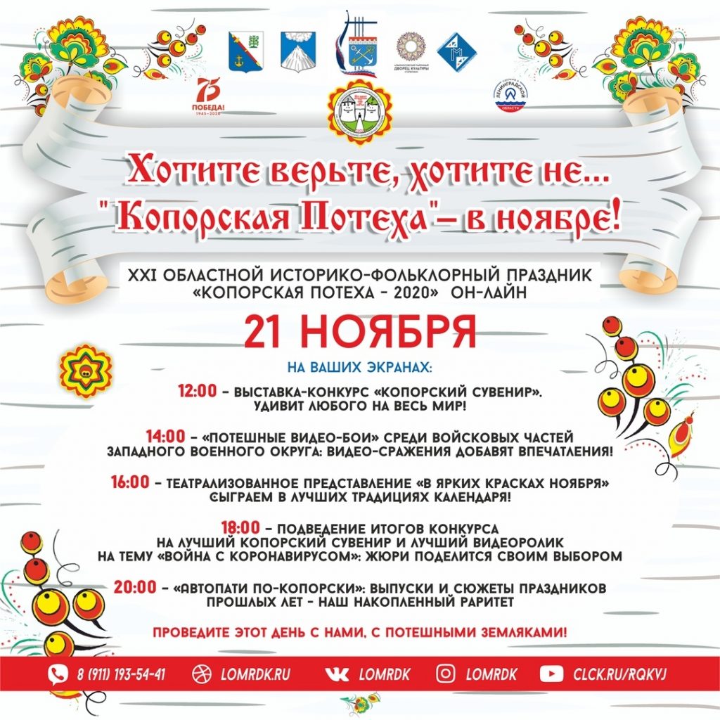 Несмотря на сложную эпидемиологическую ситуацию и реставрацию Копорской крепости, областной историко-фольклорный праздник «Копорская Потеха» состоится в режиме онлайн в социальных сетях ⃣⃣ ноября.