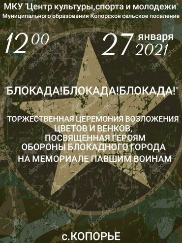 27 января в 12:00 «Блокада! Блокада! Блокада!» Торжественная церемония возложения цветов и венков, посвященная героям обороны блокадного города на мемориале павшим воинам Опубликовано 26.01.2021 в рубрике Афиша, Новости