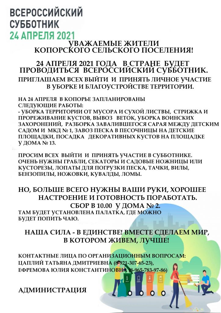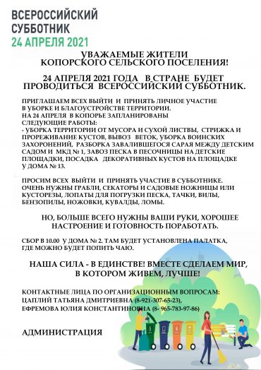24 Апреля Приглашаем всех на всероссийский субботник !!! Опубликовано 20.04.2021 в рубрике Афиша, Мероприятия, Новости