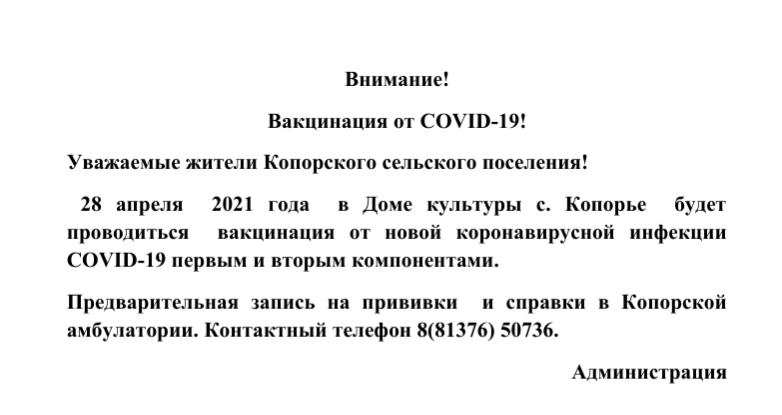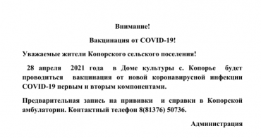 ВНИМАНИЕ! Вакцинация от COVID-19! 28 Апреля 2021 в Доме культуры с.Копорье. Предварительная запись и справки по тел. 8(81376) 50736 Опубликовано 27.04.2021 в рубрике Афиша, Новости