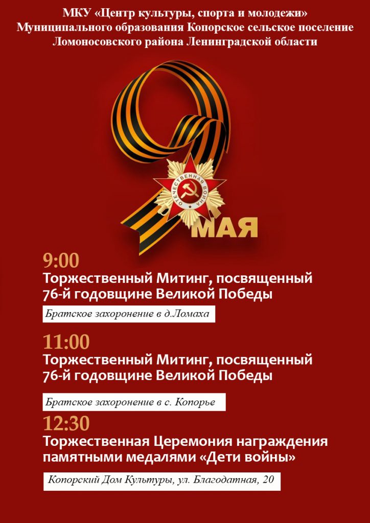Дорогие жители и гости! Приглашаем вас 9 мая на торжественный Митинг, посвященный 76-й годовщине Великой Победы Опубликовано 01.05.2021 в рубрике Афиша, Мероприятия, Новости