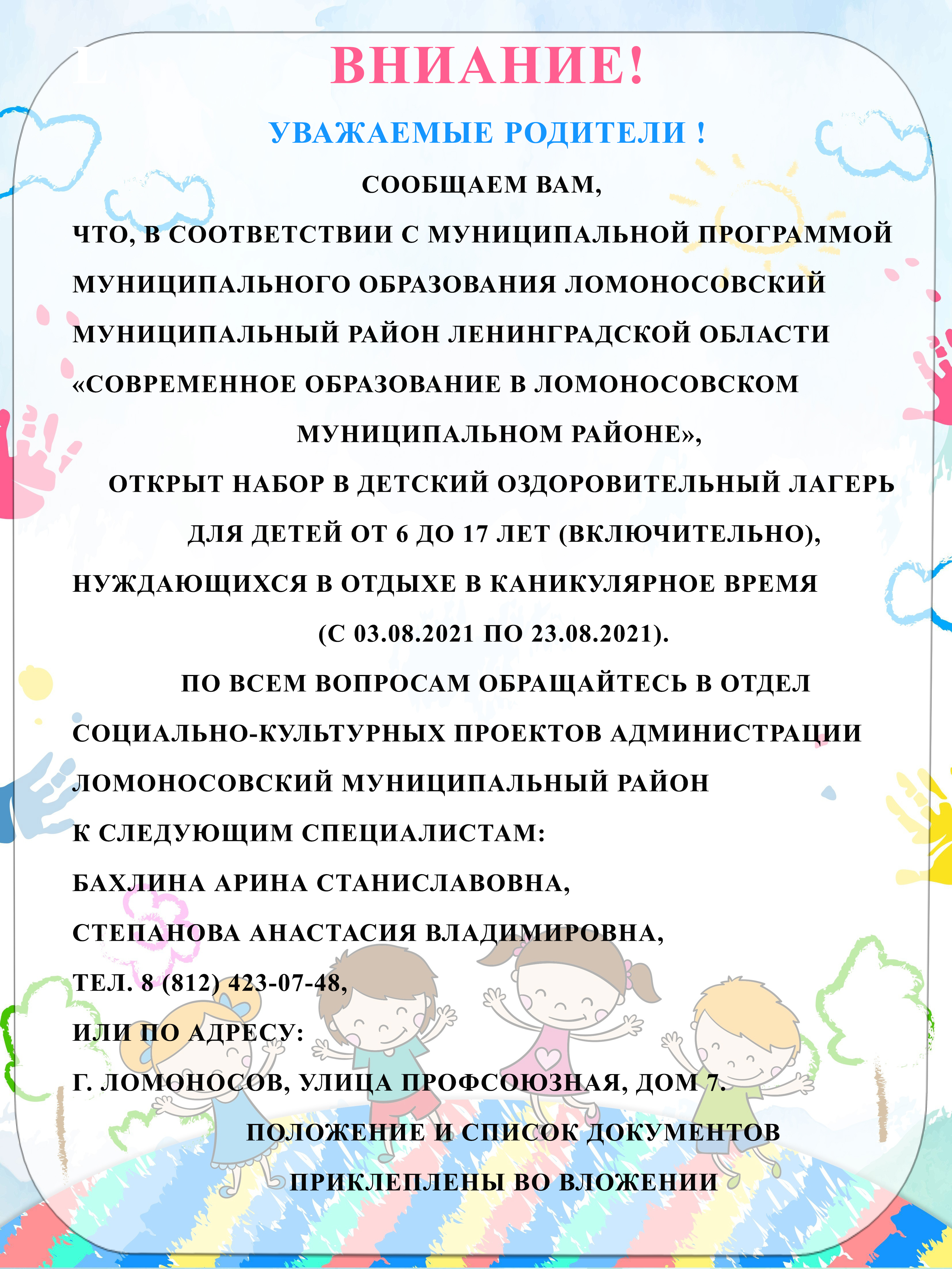 Уважаемые Родители! сообщаем Вам, что, в соответствии с муниципальной программой муниципального образования Ломоносовский муниципальный район Ленинградской области «Современное образование в Ломоносовском муниципальном районе» Открыт набор в детский оздоровительный лагерь! (с 03.08.2021 по 23.08.2021). Вся информация прикреплена во вложении.