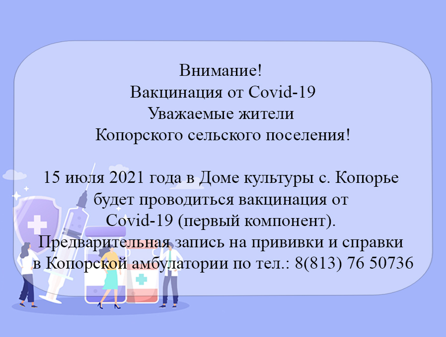 Внимание! Вакцинация от Covid-19 Уважаемые жители Копорского сельского поселения! 15 июля 2021 года в Доме культуры с. Копорье будет проводиться вакцинация от Covid-19 (первый компонент). Предварительная запись на прививки и справки в Копорской амбулатории по тел.: 8(813) 76 50736
