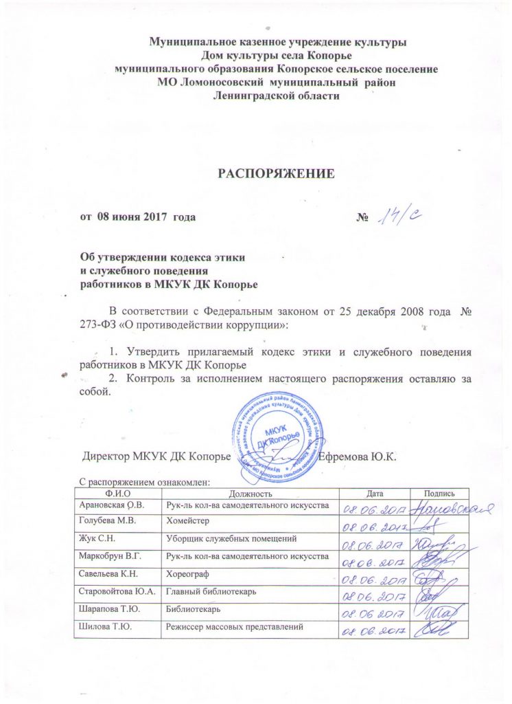 Распоряжение об утверждении кодекса этики и служебного поведения работников в МКУК ДК Копорье от 08.06.2017 года Опубликовано 08.06.2017 в рубрике Документы, Документы