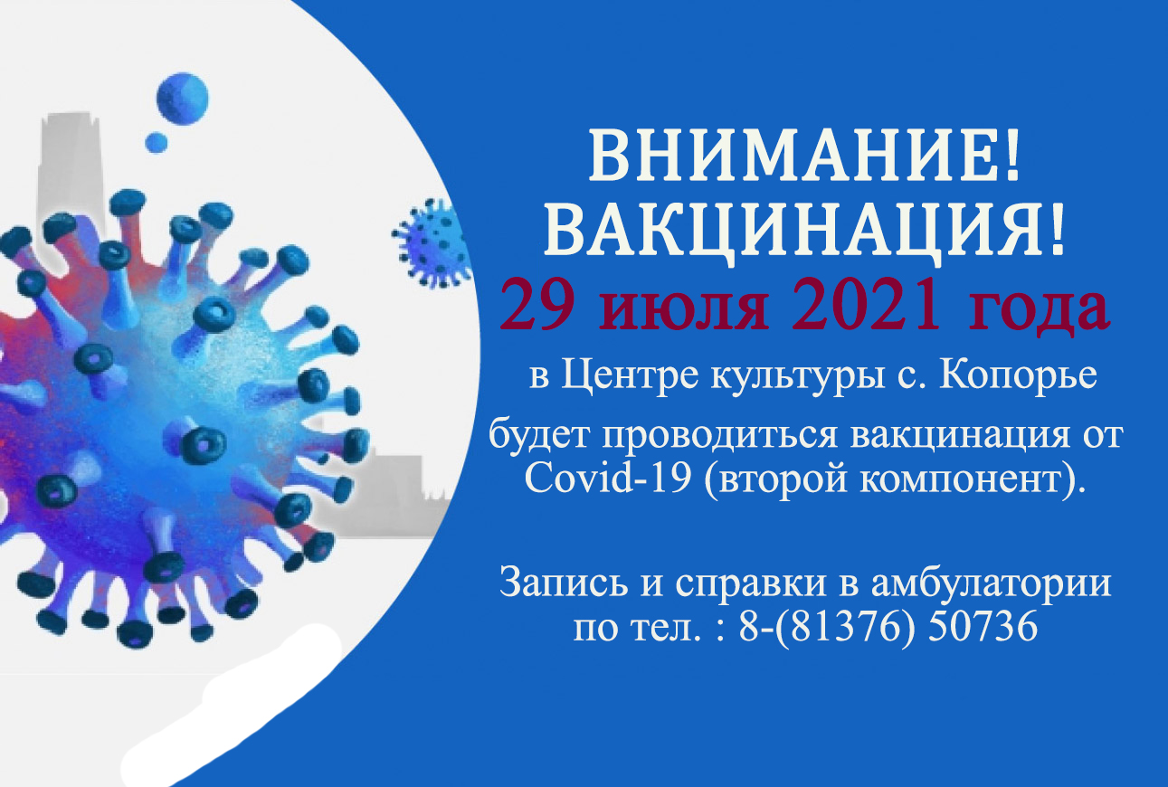 Внимание! Вакцинация от Covid-19 Уважаемые жители Копорского сельского поселения! 29 июля 2021 года в Доме культуры с.Копорье будет проводиться вакцинация от Covid-19 (второй компонент). Предварительная запись на прививки и справки в Копорской амбулатории по тел.: 8(813) 76 50736
