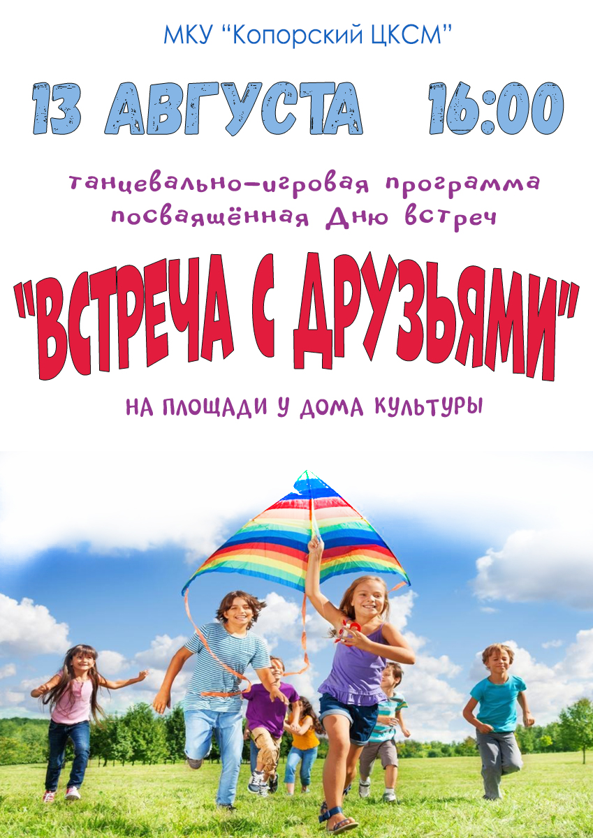 13 Августа в 16:00 Приглашаем на танцевально-игровую программу «Встреча с друзьями» на площади у Дома культуры Опубликовано 09.08.2021 в рубрике Афиша, Новости