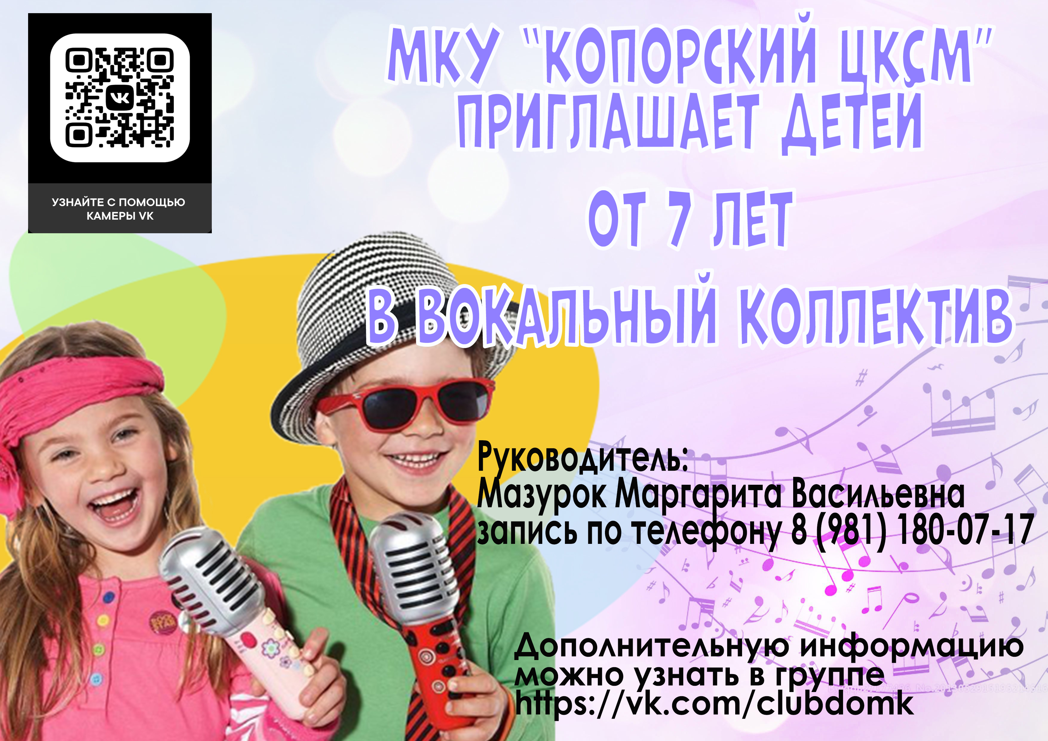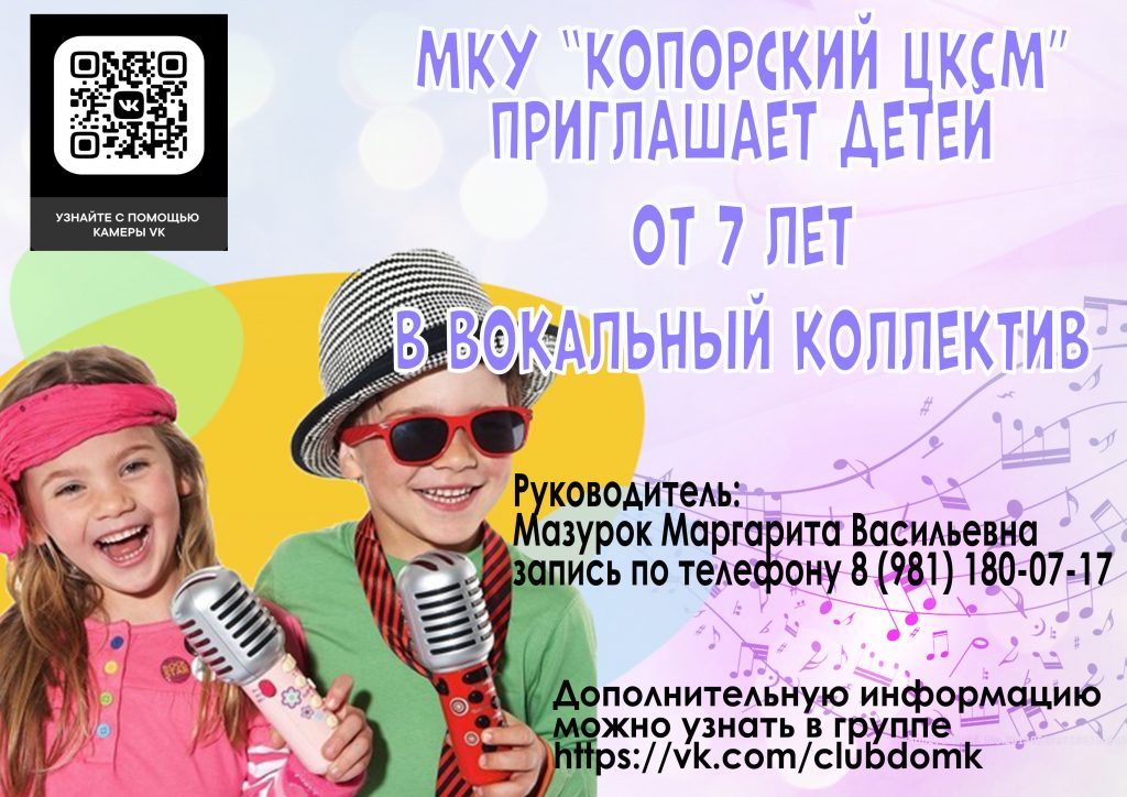 МКУ «Копорский ЦКСМ» объявляет набор в вокальный коллектив, детей от 7 лет. Запись по телефону 8(981)180-07-17. Руководитель Мазурок Маргарита Васильевна.