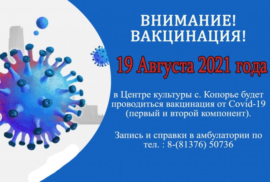 Внимание! Вакцинация от Covid-19 Уважаемые жители Копорского сельского поселения! 19 Августа 2021 года в Доме культуры с.Копорье будет проводиться вакцинация от Covid-19 (второй компонент). Предварительная запись на прививки и справки в Копорской амбулатории по тел.: 8(813) 76 50736