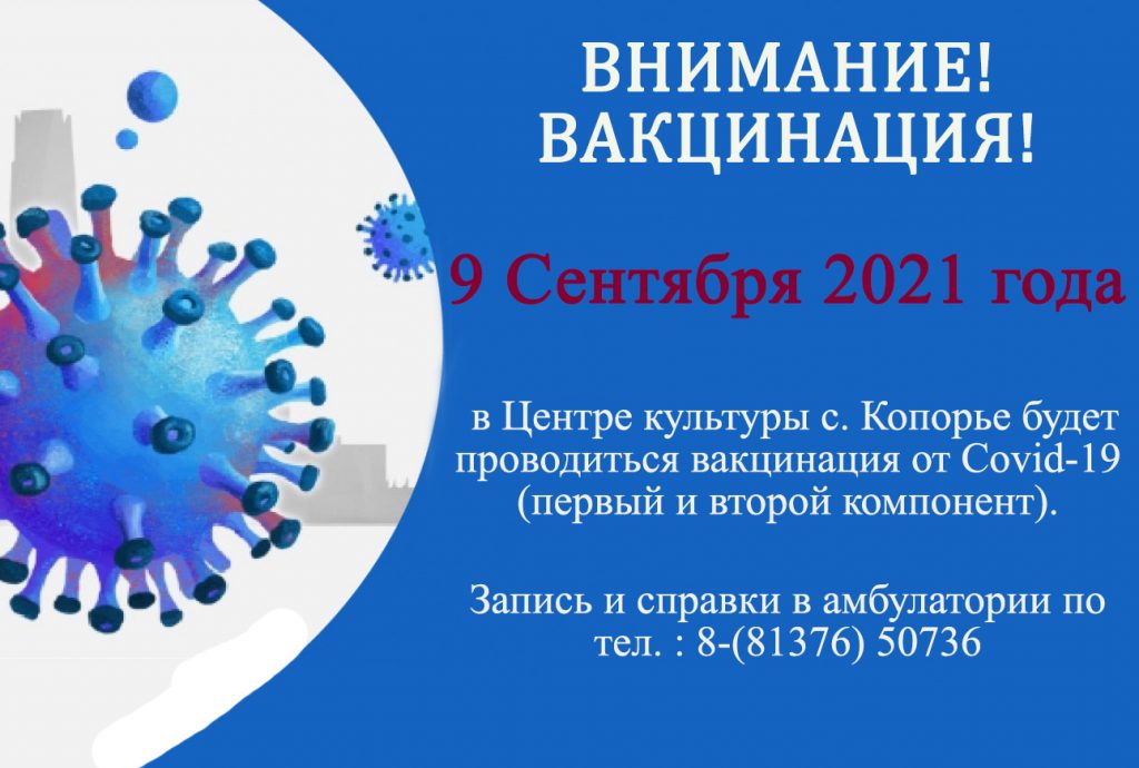 Внимание! Вакцинация от Covid-19 Уважаемые жители Копорского сельского поселения! 9 Сентября 2021 года в Доме культуры с.Копорье будет проводиться вакцинация от Covid-19 (второй компонент). Предварительная запись на прививки и справки в Копорской амбулатории по тел.: 8(813) 76 50736