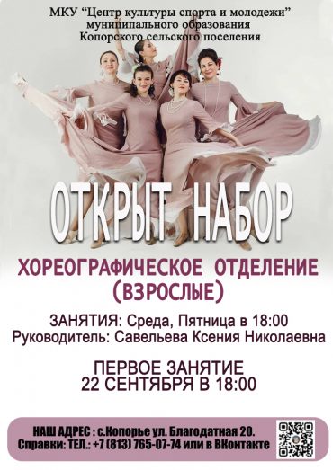 ОТКРЫТ НАБОР на ХОРЕОГРАФИЧЕСКОЕ ОТДЕЛЕНИЕ (ВЗРОСЛЫЕ). ЗАНЯТИЯ: Среда, Пятница в 18:00 Руководитель: Савельева Ксения Николаевна. ПЕРВОЕ ЗАНЯТИЕ: 22 СЕНТЯБРЯ В 18:00