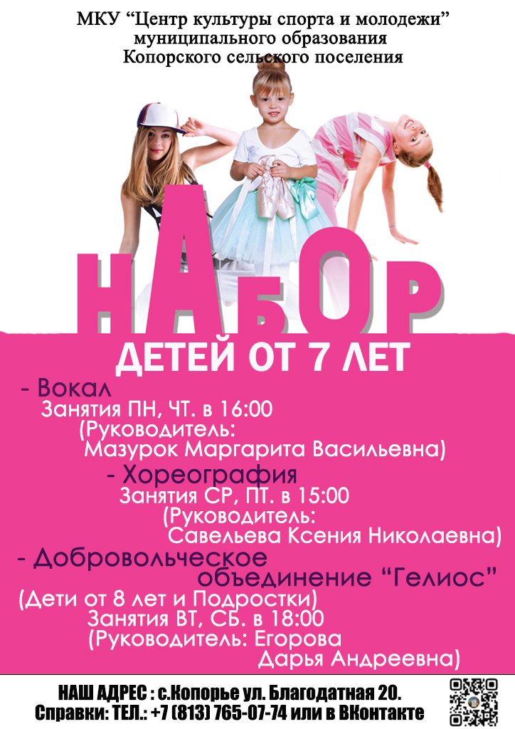ОТКРЫТ НАБОР в ТВОРЧЕСКИЕ ОБЪЕДИНЕНИЯ Для детей от 7 лет Опубликовано 14.09.2021 в рубрике Афиша, Новости ОТКРЫТ НАБОР в ТВОРЧЕСКИЕ ОБЪЕДИНЕНИЯ Для детей от 7 лет НАШ АДРЕС : с.Копорье ул. Благодатная 20. Справки: ТЕЛ.: +7 (813) 765-07-74 или в ВКонтакте