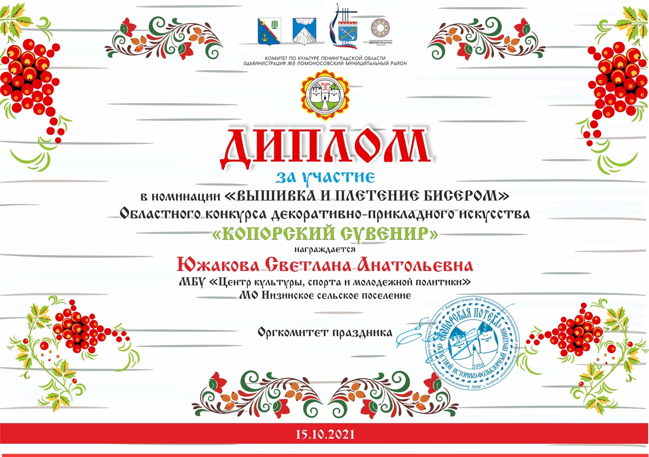 Корженко Марина Витальевна, МБУ «Центр культуры, спорта и молодежной политики МО Низинское СП», номинация «кружевоплетение»