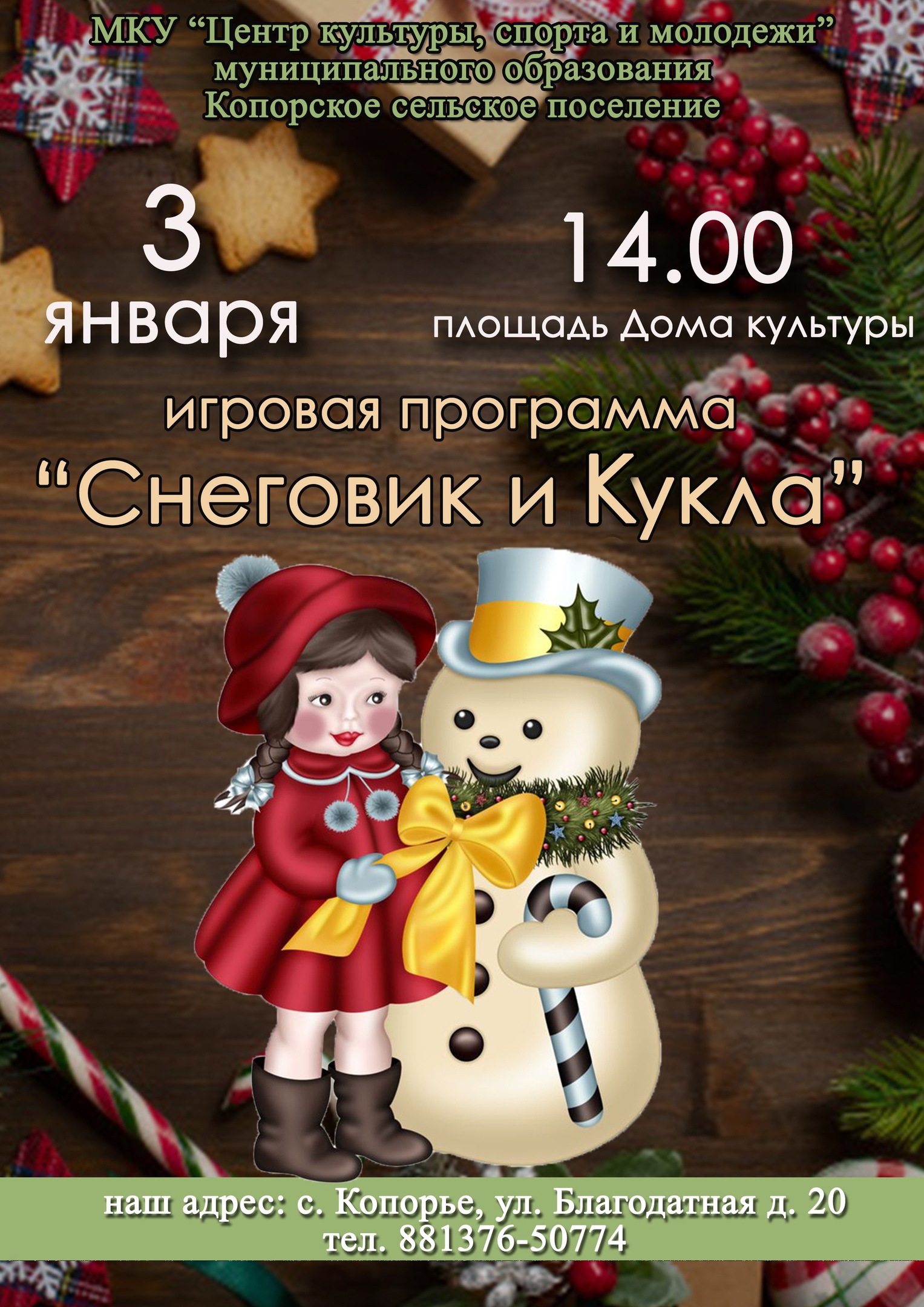 3 Января в 14:00 приглашаем всех на игровую программу «Снеговик и Кукла» Опубликовано 01.01.2022 в рубрике Афиша, Новости