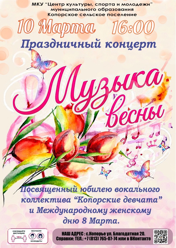 10 Марта в 16:00 Праздничный концерт «Музыка весны» посвященный юбилею вокального коллектива «Копорские девчата» и Международному женскому дню 8 Марта Опубликовано 03.03.2022 в рубрике Афиша, Новости