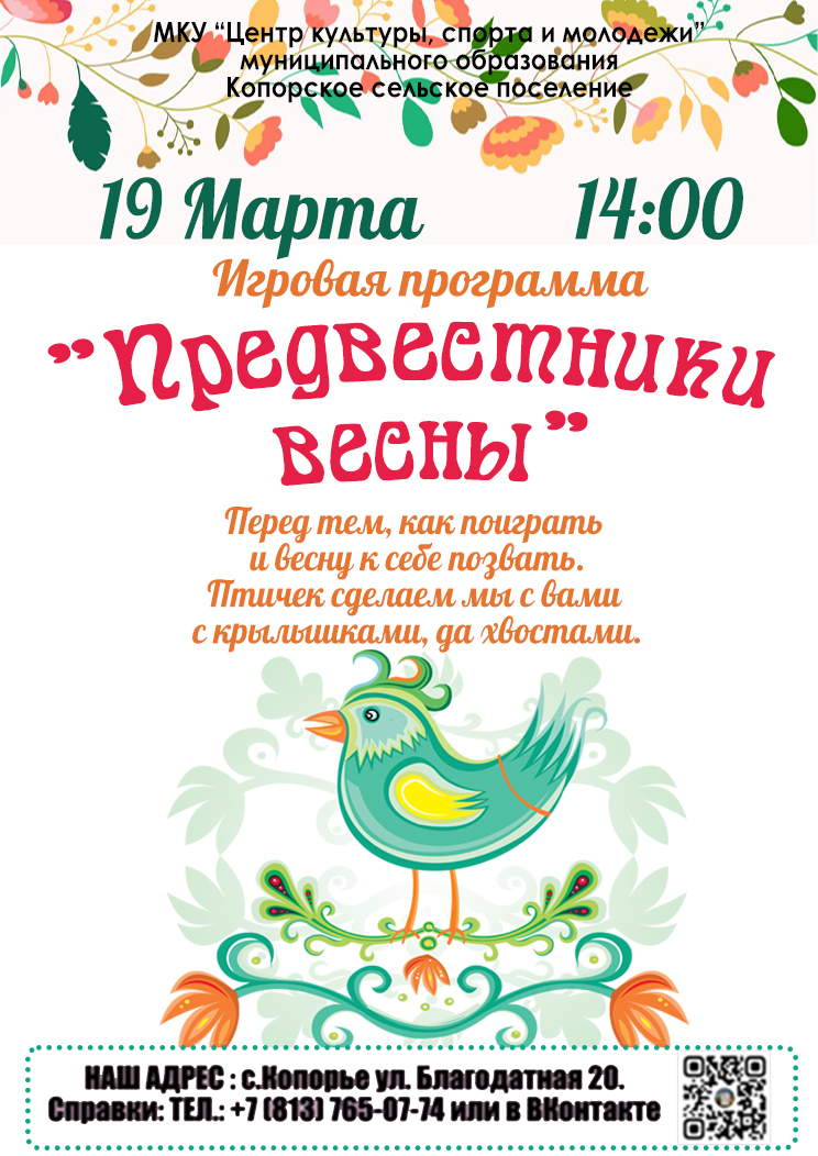 19 Марта в 14:00 Игровая программа «Предвестники весны» Опубликовано 16.03.2022 в рубрике Афиша, Новости