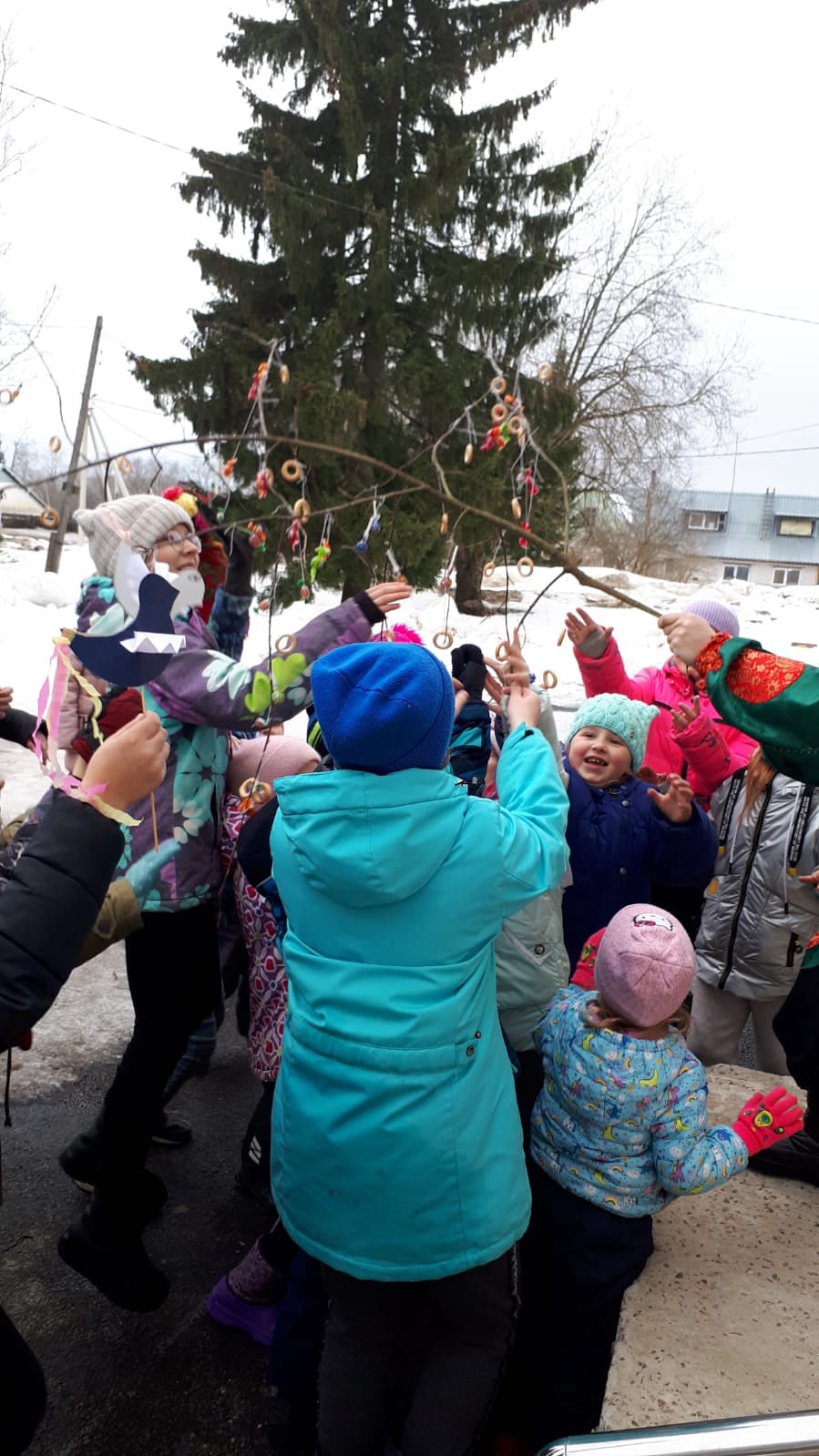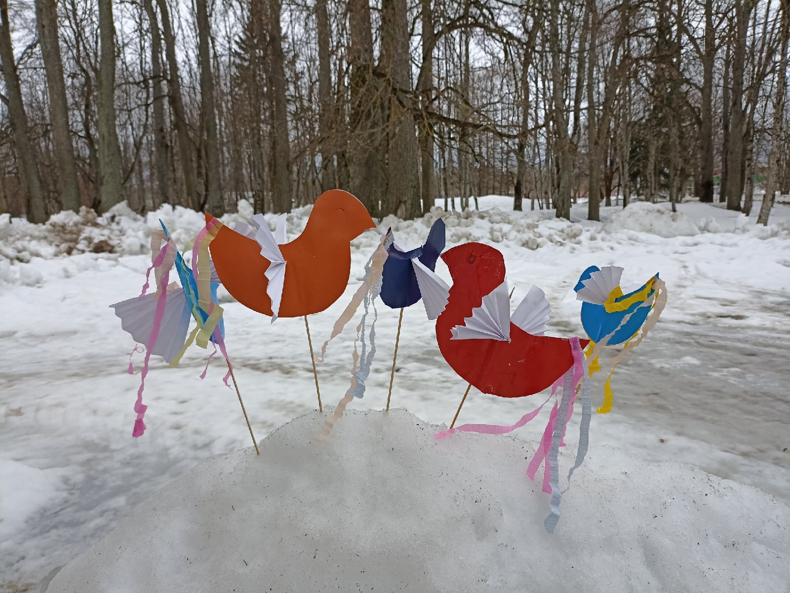 ПРЕДВЕСТНИКИ ВЕСНЫ игровую программу для копорских ребятишек, провели скоморохи Манька да Кулёма. Все вместе, под весёлую музыку, с играми и забавами, мы сделали птичек — жаворонков и встретили Весну — Красну.