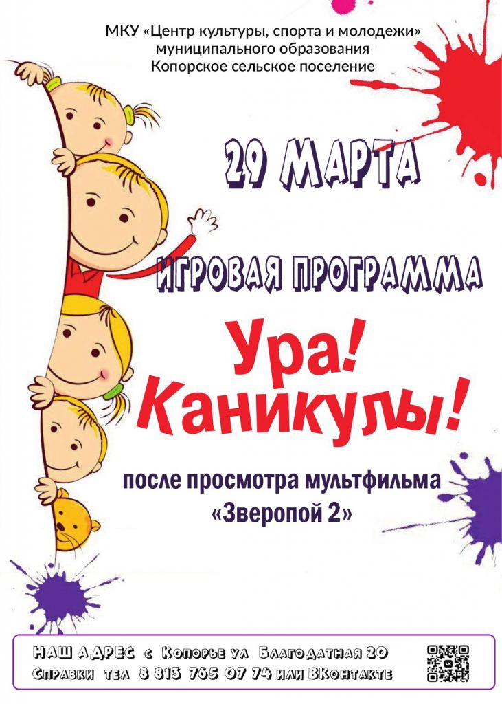 29 Марта после просмотра мультфильма, детская игровая программа «Ура» Каникулы!» Опубликовано 27.03.2022 в рубрике Афиша, Новости
