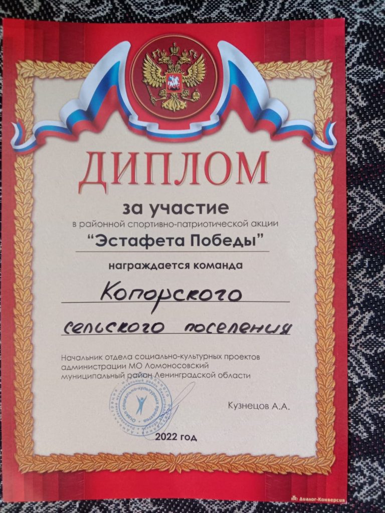 4 мая 2022 года, молодёжная команда Копорского СП, под руководством нового сотрудника Центра культуры, инструктора по спорту Юрия Николаевича Тихонова, приняла участие в Молодёжно — спортивной акции, посвящённой Дню Победы в Великой Отечественной войне «Эстафета Победы «, проведённой по инициативе МБУ «Районный центр культуры и молодёжных инициатив» МО Ломоносовский муниципальный район Ленинградской области.