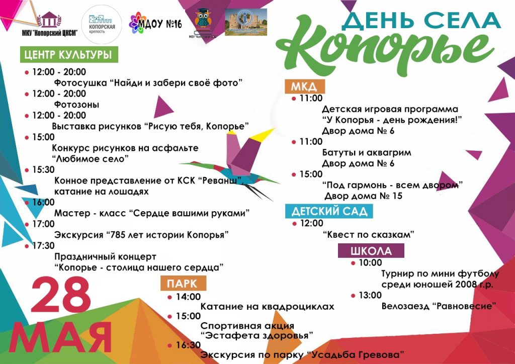 Уважаемые жители Копорского СП, в этом году, нашему родному селу исполняется 785 лет. Праздник День села, состоится 28 мая 2022 года. Всех Вас, и взрослых и детей, в День рождения села, ждёт обширная программа, финалом которой будет праздничный концерт «Копорье — столица нашего сердца», на площади возле Центра культуры.