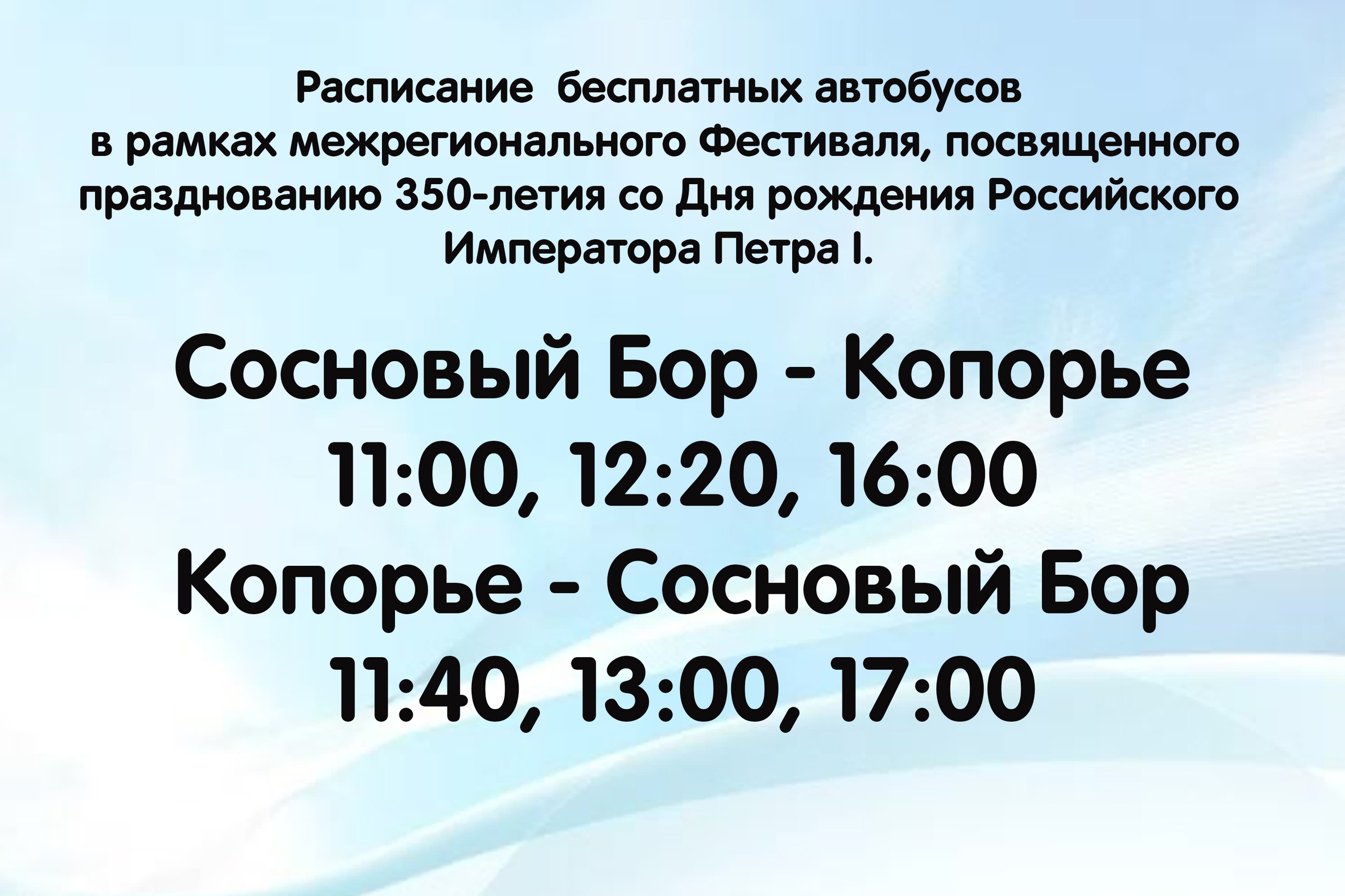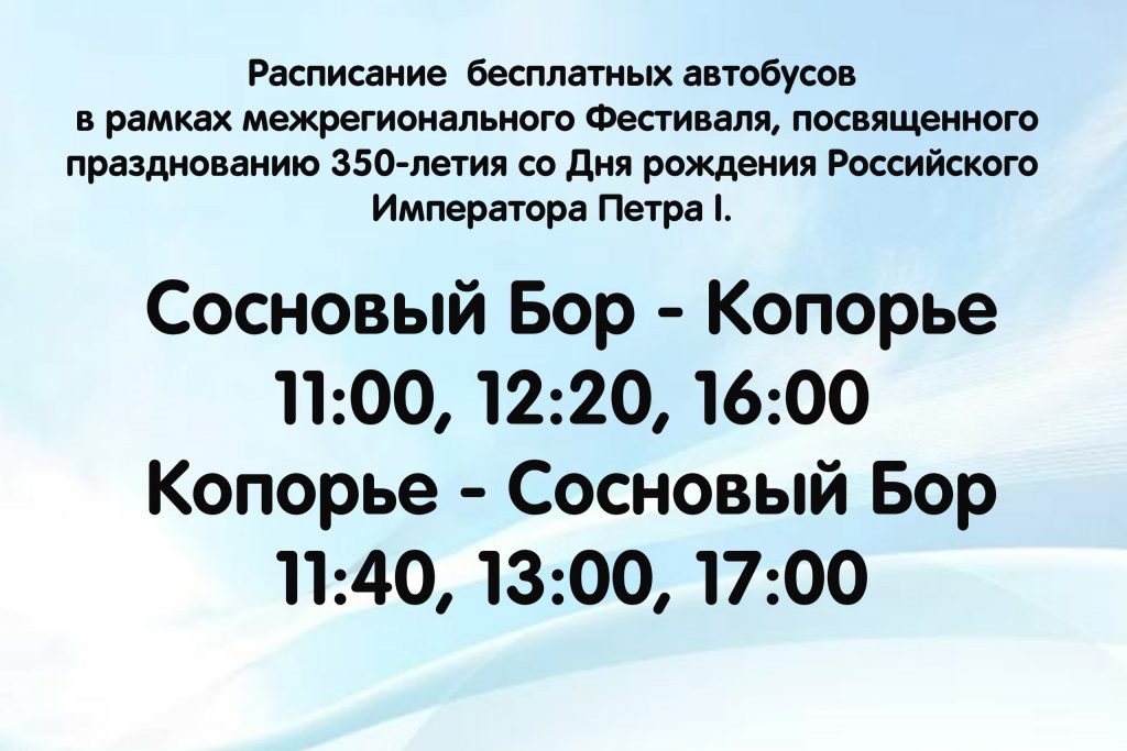 Для всех желающих посетить праздник, в день фестиваля, между г.Сосновый Бор и с.Копорье, будет курсировать бесплатный автобус.