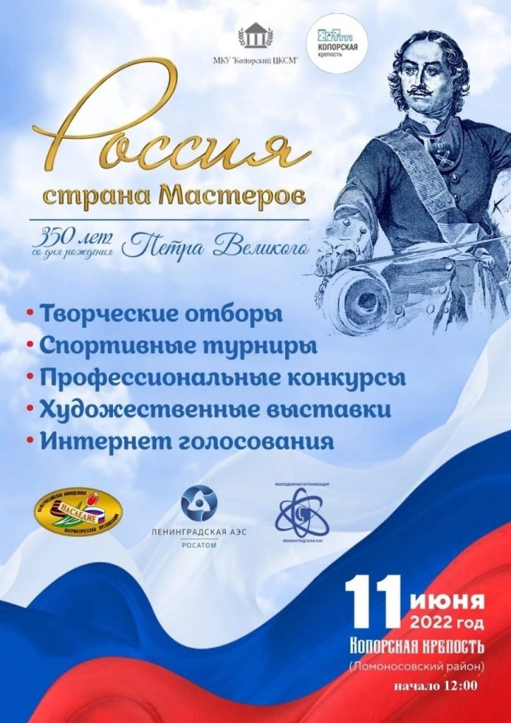 11 июня 2022 года, в селе Копорье, у стен древней Копорской крепости , состоится межрегиональный Фестиваль, посвященный празднованию 350-летия со Дня рождения Российского Императора Петра I.