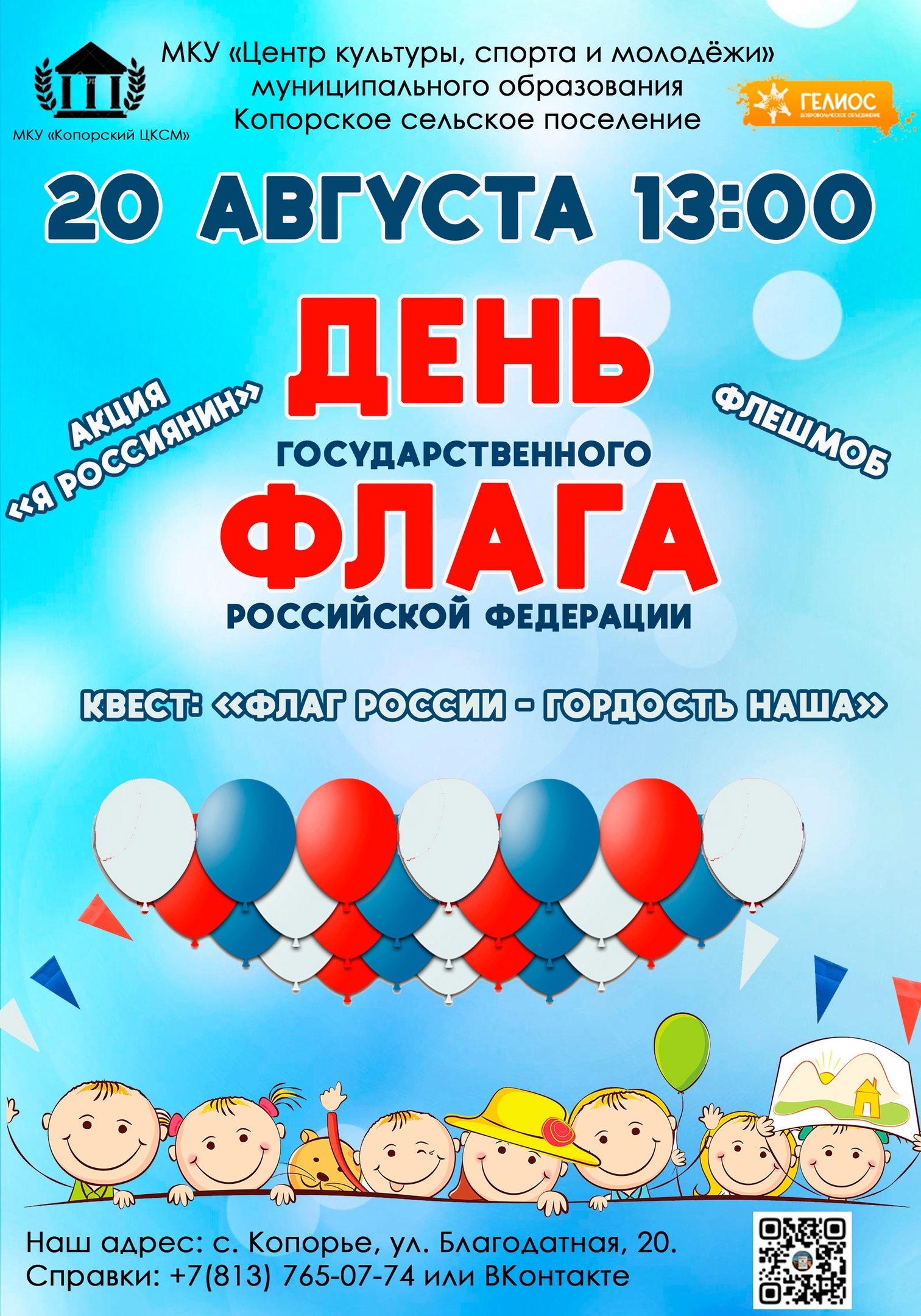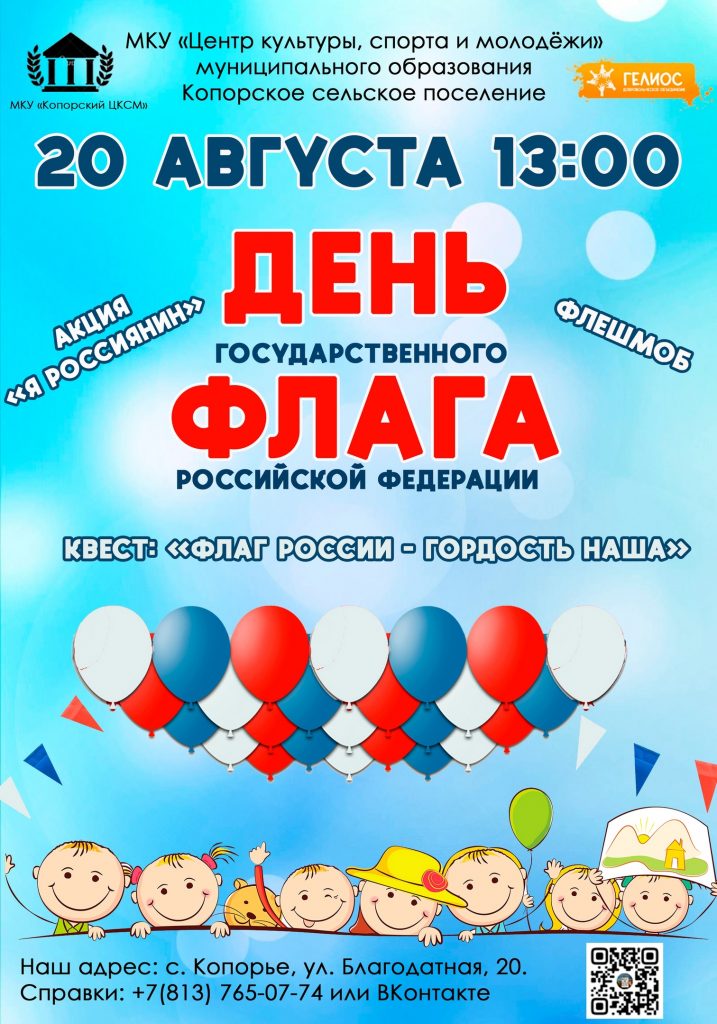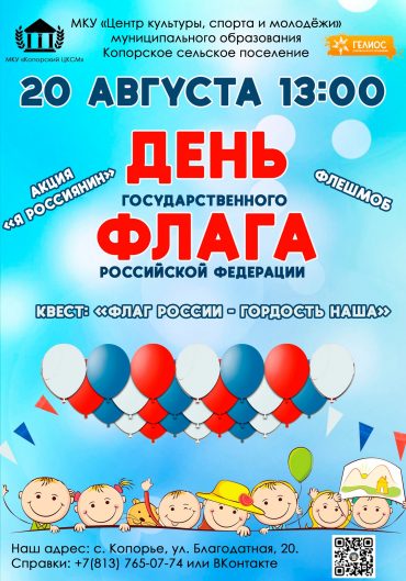 20 августа в 13:00 приходи на площадь МКУ «Центр культуры, спорта и молодежи»Копорье и отмечай День государственного флага Российской Федерации вместе с нами!