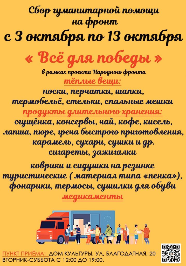 С 3 октября по 13 октября в рамках проекта Народного фронта «Все для Победы!», в Центре культуры организован пункт приема гуманитарной помощи на фронт.