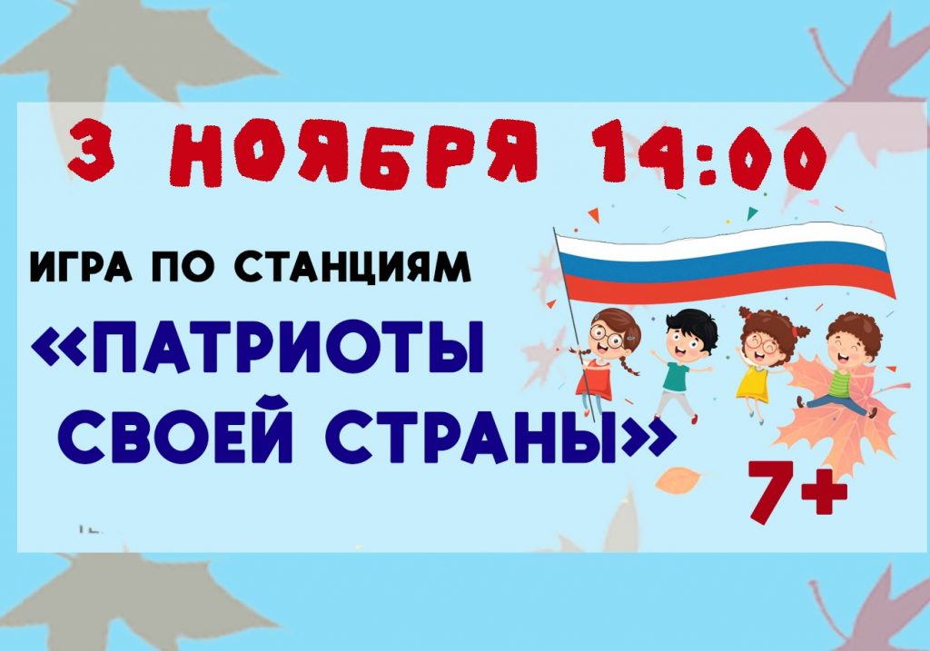 Юных гостей и жителей Копорья, 3 ноября в 14:00 приглашаем на увлекательную игру по станциям «Патриоты своей страны». Опубликовано 02.11.2022 в рубрике Афиша, Новости Каникулы продолжаются! Юных гостей и жителей Копорья, 3 ноября в 14:00 приглашаем на увлекательную игру по станциям «Патриоты своей страны». Возраст: 7+ При себе необходимо иметь сменную обувь.