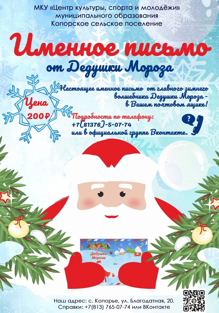 В качестве небольшого привета от Деда Мороза, в МКУ «Центр культуры, спорта и молодежи»Копорье, можно заказать именное, ответное письмо от главного зимнего волшебника!✉