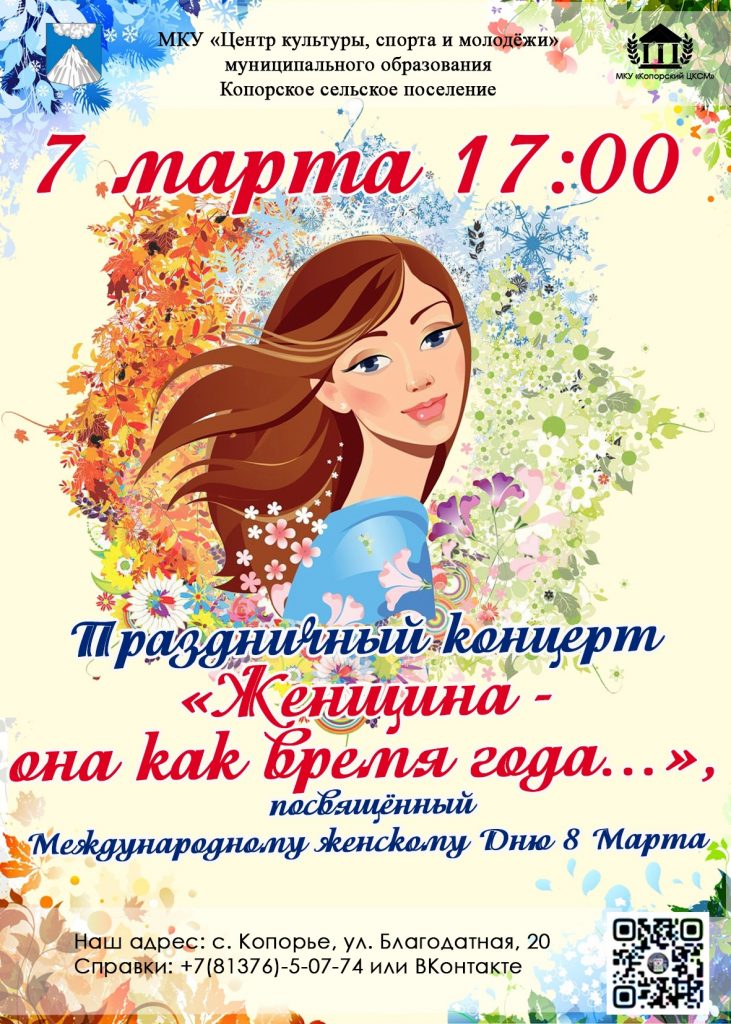 💐7 марта в 17:00 приглашаем всех гостей и жителей Копорского сельского поселения, на праздничный концерт — 🌷🍁 «Женщина — она как время года…».❄☀